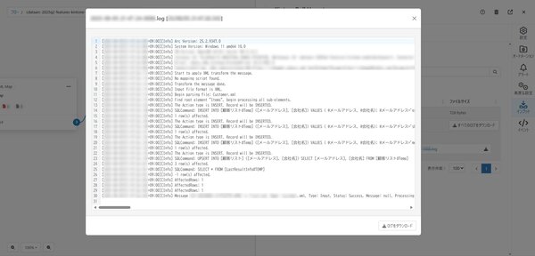 Upsert アクションにおけるデフォルトの振舞いでなく「デザインモードを利用して一括Upsert リクエストを構成」した場合、挙動としては「kintone コネクタの内部的な振舞いの違い」として作用しますので、一括Upsert でリクエストされているかどうかは、kintone コネクタのコネクタログで確認することができます。コネクタログを見てみると、一時テーブル(顧客リスト#Temp)にInsert した後、顧客リストへUpsert リクエストされていることが確認できます。