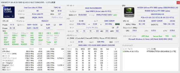 今回お借りしたモデルは、Core Ultra 9 275HXとGeForce RTX 5080 Laptopを搭載。メモリーは32GB、ストレージは1TB