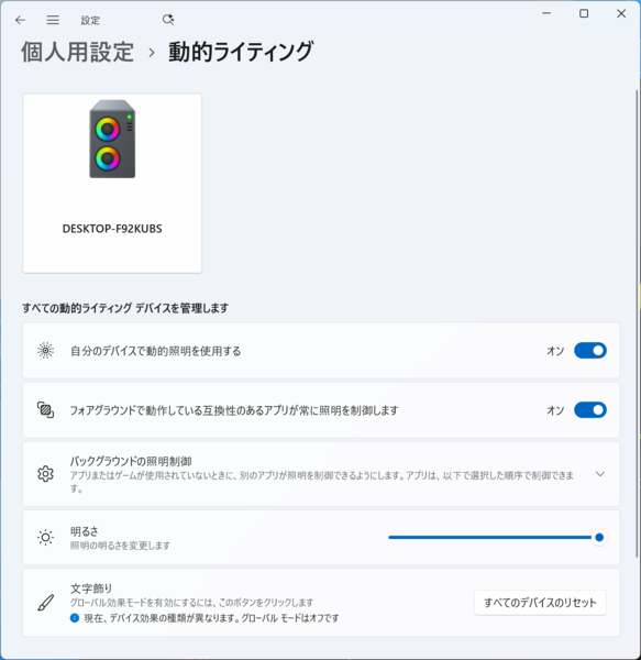 LEDイルミネーションは、Windowsの「動的ライティング」で設定可能。ASUSの「Aura Sync」でも設定できるが、その場合は「動的ライティング」で「自分のデバイスで動的照明を使用する」をオフにする必要がある