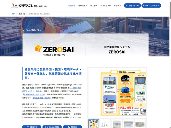 気象予測・気象関連計測機器メーカーでもある民間気象会社シスメットは、同社が展開する自然災害防災システム「ZEROSAI」にメカトラックスのデバイスを採用している。同システムは、建設現場や伐採現場など災害リスクの高い環境で気象データや環境データを収集し、現場にフィードバックする危機管理システムだ。