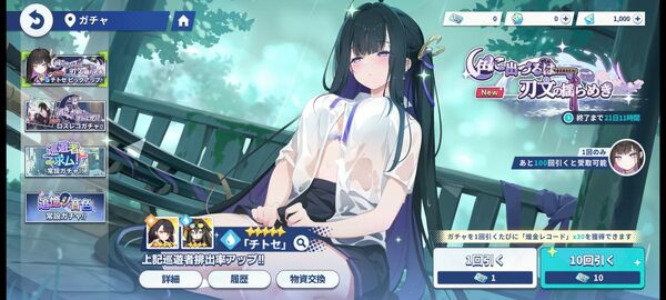 現在は★5限定キャラとして「チトセ(CV:月城日花さん)」がピックアップ中。黒髪日本刀美少女ということで、癖に刺さるユーザーが続出。彼女を求めて「リセマラ2時間以上やってる」「完凸に15万円かかりました!」などの声があがっている。