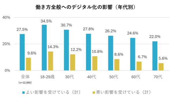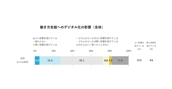 まず、働き方におけるデジタル化の影響を尋ねたところ、「働き方全般について変わらない」と感じている人が45.1%で最多となり、「よい影響を受けている(計)」が27.5%、「悪い影響を受けている(計)」が9.6%という結果だった。よい影響を受けていると回答した人の方が、悪い影響を受けていると回答した人より17.9ポイント多いという差も出ている。