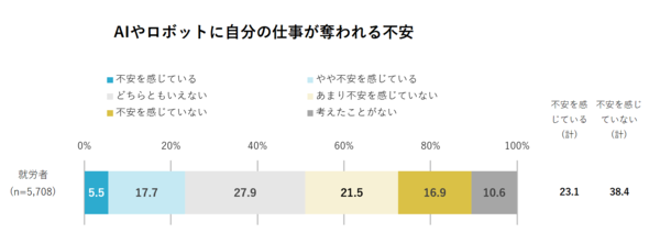 現在働いている人を対象に、「AIやロボットに自分の仕事を奪われる不安」を尋ねたところ、「不安を感じている(計)」が23.1%、「どちらともいえない」27.9%、「不安を感じていない(計)」38.4%、「考えたことがない」10.6%という結果だった。