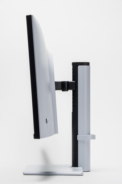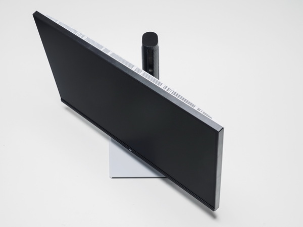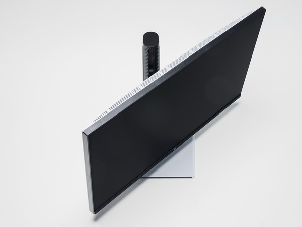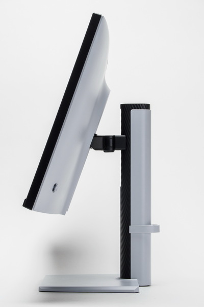 高さ調整は130mmで、上下ティルトは上20°、下5°、左右のスイベル角度は各45°で、左右両方向に90°パネル回転が可能で、縦長での利用も可能だ。