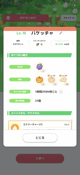 さらに驚かされたことに、バケッチャは新食材「ずっしりカボチャ」を拾ってくる食材得意のポケモン。10月27日には新レシピも実装されると予想されるので、今日捕まえたバケッチャで少しでもカボチャを集めておくといいかもしれない。