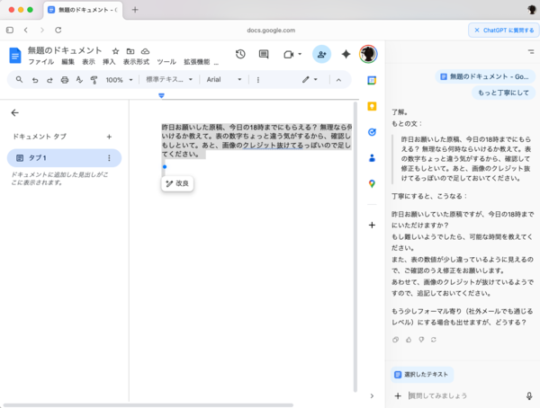 入力フォームやメール文面に対して、「丁寧に」「もっと短く」と指示するだけでトーンや表現を調整できる。 - 専門用語や内容の補足説明