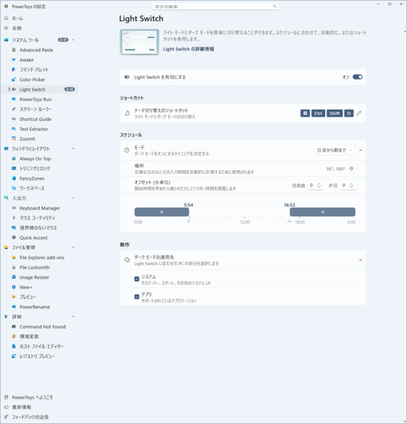 10月16日にPowerToysの安定版、Release v0.95.0が公開された。新機能は、日の出と日没などの時刻でダークモード、ライトモードの切り替えをする「Light Switch」のみ。