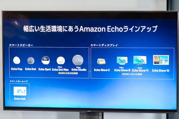 スマートスピーカーとスマートディスプレーのシリーズであるEchoは次世代の「Alexa+」(国内展開は未定)に対応。「Echo Dot Max」(1万4980円、10月下旬発売)、「Echo Studio」(11月中旬発売、3万9980円)、「Echo Show 8」(3万4980円、11月中旬発売)、「Echo Show 11」(3万9980円、11月中旬発売)などが発売となる。