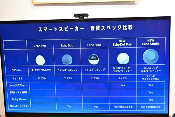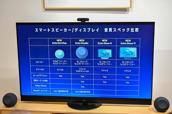 会場では、新しいEchoシリーズのサウンドを体験できた。新シリーズのEcho Dot MaxやEcho Studioの第2世代、EchoShowなどを単体ステレオペアでデモしたほか、近日投入予定だというAlexaホームシアター機能(Fire TVとの組み合わせで5.1ch再生に対応)も実演された。