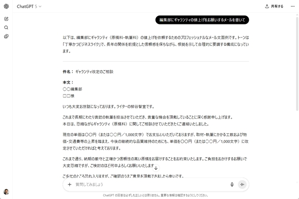 まずは、ギャランティの値上メールを書いて、と直球で入力してみた。すると、そつなく値上げ交渉の文章を生成してくれる。値上げの理由として、「取材・執筆にかかる工数および物価・交通費等の上昇を踏まえ、今後の継続的な品質維持のため」と述べており、いい感じだ。