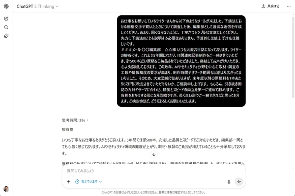 生成された本文では、編集部に感謝しつつ、さらっと実績(納品本数)を入れ込み存在感をアピール。値上げの理由は「取材・調査の工数や情報精度の要求が高まり、制作時間やリサーチ範囲も以前より広がった」としている。十分に納得してもらえそうな切り口だ。