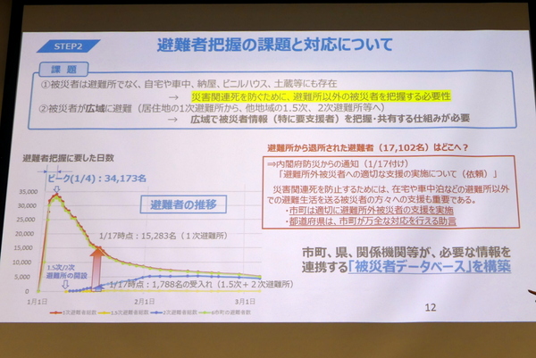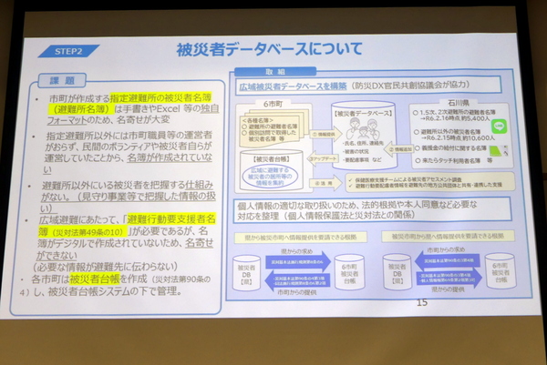 続くステップ2の被災者データベースは、今までなかったものだ。大雨や局所的な災害対策は被害者が避難所から自宅に戻った段階で終わるが、家屋に被害の出た能登半島地震の場合、被災者は避難所だけではなく、自宅、車中、納屋、ビニールハウス、土蔵などさまざまな場所におり、住民票がある市町以外の広域避難者も日を追うごとに増えていった。「1月4日に3万4000人いた避難者が、1月17日に1万5000人になっている。避難所から退所された1万7000人がどこに行ったのかを把握できなかった」と西垣氏は振り返る。