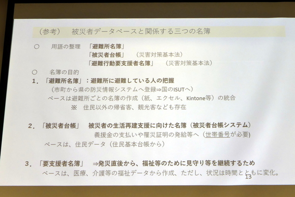西垣氏は、被災者データベースと関係する3つの名簿についても紹介した。まず避難している人を把握するために避難所ごとに作られた「避難所名簿」。ここには住民以外の帰省客や観光客も含まれており、紙やExcel、kintoneなどで収集された情報は、市町から防災総合情報システムに登録される。