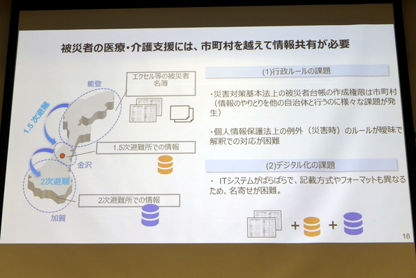 個人情報を官民で共有する被災者データベースは医療のみならず、福祉の分野でも重要になる。昨今では、災害で直接亡くなる災害死(直接死)のみならず、避難生活の心理負担や持病の悪化、医療体制の不備など、災害に起因する間接的な原因で亡くなる「災害関連死」が注目されている。実際、熊本地震では災害死(直接死)が50人だが、災害関連死はその4倍に上っており、能登半島地震でも災害関連死は直接死の2~3倍になると見られている。災害関連死を防ぎ、被災者たちに必要な支援を提供するために必要なのが、被災者データベースだ。