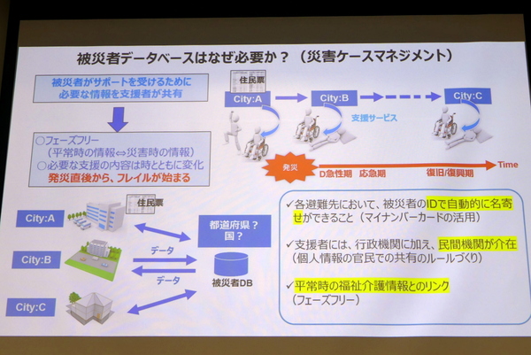 総論として西垣氏が課題として挙げたのは、災害対策基本法上の被災者台帳の作成権限が市町村にしかないため、他の自治体とのやりとりで不備が生じること。そして、個人情報保護法の例外として、災害時の運用ルールがあいまいであることを挙げた。そしてデジタル上の課題として、システムがバラバラで、記載方式やフォーマットも異なっているため、名寄せが困難であることを挙げた。