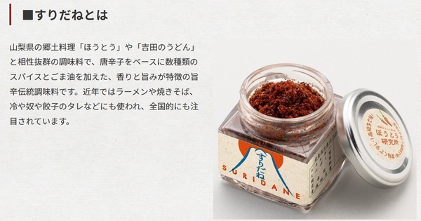 「すりだね」は、唐辛子をベースに数種類のスパイスとごま油を加えた、香りと旨みが特徴の山梨県の伝統的な旨辛調味料です。