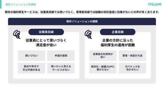 従来の福利厚生サービスは、従業員にとって使い勝手が悪く、申請の手間や制度の不公平感から利用率が伸びにくいという課題がありました。管理者側にとっても、企業方針や人事戦略と結びつけた活用が難しいのが現状です。拠点や世代間で不公平感が生じやすく、一人ひとりに届けたい支援が届きづらい課題もあります。