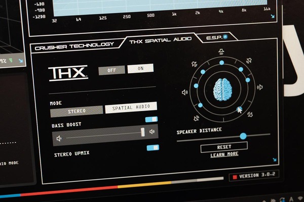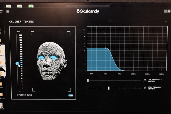 専用アプリはPC版とスマホ版の両方を用意しており、低音振動(Crusherベース)の強弱やTHX再生時のスピーカーとの距離、周波数帯域のカスタマイズが可能。E.S.P.という個人最適化機能も備えているので、自分の聞こえ方にあった調整が可能だ。PC版の「SKULL-HQ」では7chに相当するスピーカーの基準位置やEQをより細かく調整(スマホ版は5バンド、PC版は10バンド)できるなど、より細かな設定ができるようになっている。EQモードはデフォルト、RPG、FPS、ミュージック、カスタムが選べる。