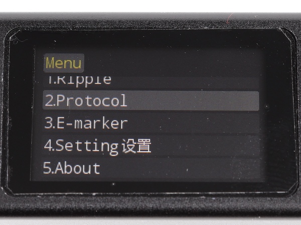 まずはUSB PD対応の充電器を用意し、KWS-X1を接続。Sinkモードをオンにしていると、起動するはずです。続いて、基本画面からBACKボタンを押してメニューを表示し、「2 Protocol」を選びます。