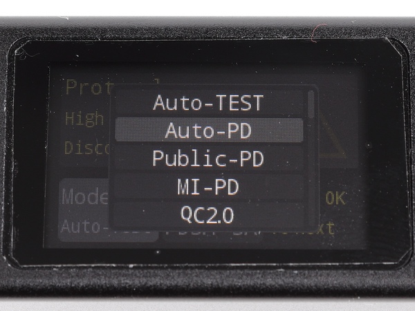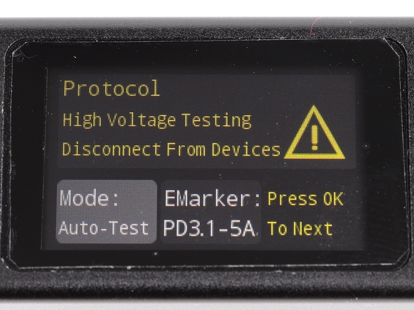 試しに、手元にあった140WのUSB PD対応充電器を見てみましょう。プロトコルテストの実行は、OKボタンの長押しです。