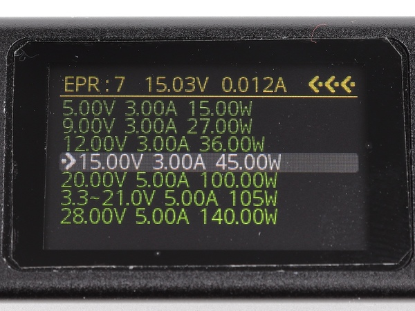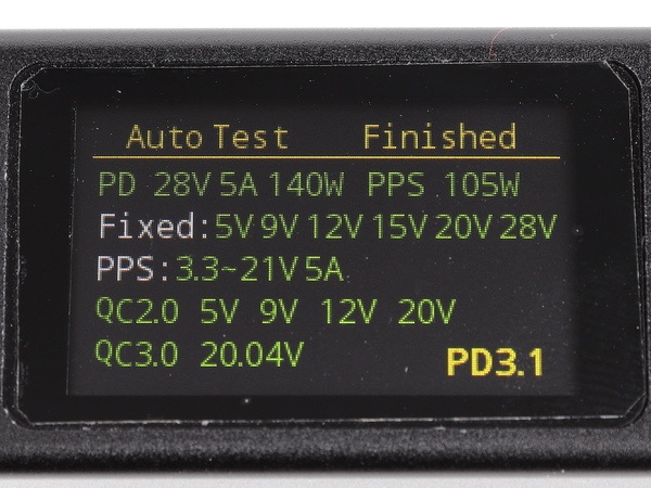 この画面から、PDは140Wまで対応で、PPSは105W対応、電圧は5/9/12/15/20/28V出力が可能、QCは2.0/3.0対応で20Vまで、といったことがわかります。