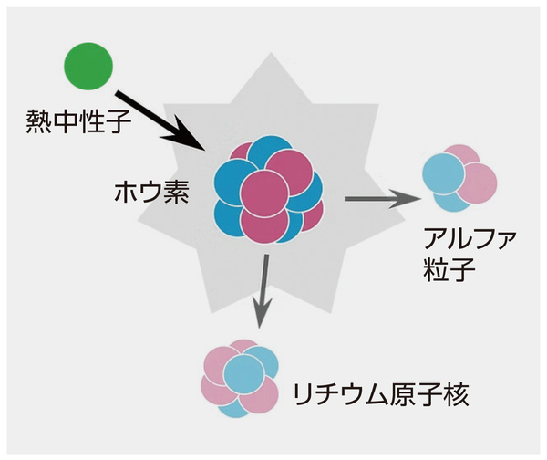 BNCT自体は既存の治療法である。生体に無害な熱中性子がホウ素に衝突すると核反応が起き、アルファ粒子とリチウム原子核が発生する(図1)。これらが、がん細胞のDNAを壊してがん細胞を殺傷するという仕組みだ。アルファ粒子とリチウム原子核の飛距離は細胞1個分にすぎないため、ホウ素をがん細胞のみに届けることができれば他の正常な細胞への影響は少ないと考えられている。