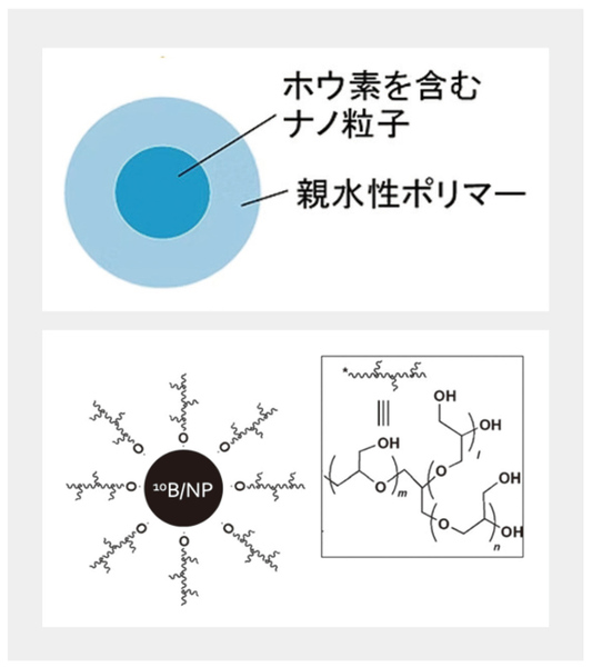 京都大学には複合原子力科学研究所という原子炉施設があり、長らくBNCTの研究開発が進められてきた。小松さんはDDS研究で扱ってきたナノダイヤモンド粒子中の炭素をホウ素に置き換えることで、大量のホウ素を効率良くがん細胞に運べるのではないかと考え、同研究所の鈴木実教授との共同研究を開始。ホウ素を豊富に含むナノ粒子を水に良く溶ける高分子(親水性ポリマー)で包んだ新しい製剤「RN-501」を開発した(図2)。これについて「鈴木さんと出会えたことにより生まれた成果です」と小松さんは振り返る。