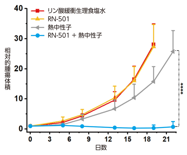 図3 マウスへの処置後経過日数と相対的腫瘍体積の変化。生理食塩水の注射(赤色)、RN-501の注射のみ(黄色)、熱中性子の照射のみ(灰色)の場合は腫瘍体積が大きくなったが、RN501を注射し熱中性子を照射(水色)したマウスは、5匹中4匹で腫瘍の消失が見られた。