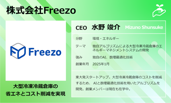そんな中、東大発スタートアップの株式会社Freezoは、大型冷凍冷蔵倉庫のエネルギーマネジメントに取り組んでいる。