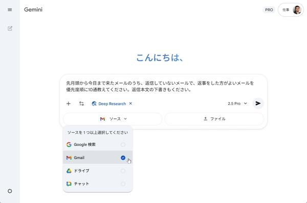 使い方は簡単。「Deep Research」をオンにすると、「ソース」というメニューが現れるので、プルダウンメニューからGmailやドライブを選択すればいい。