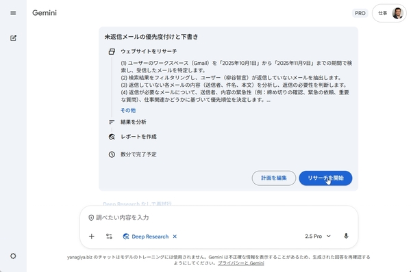 すると、「Deep Research」がどんなタスクを行うのかプランニングして聞いてくる。問題なく指示を理解していたので、そのまま「リサーチを開始」をクリックする。