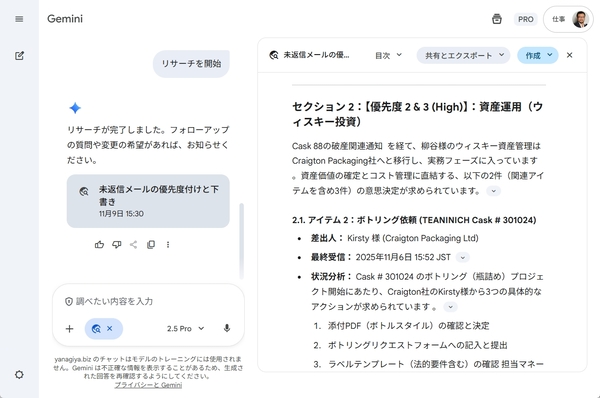 これまでも、Gmailやドライブの内容にアクセスできるAIはあったが、さすがGoogleのサービス同士、実用レベルになっている。タスクの精度というよりは、処理できるトークン数が大きく、指示を最後まで遂行してくれるというのがありがたい。今回、あえて超シンプルなプロンプトを使ったが、きちんと挙動をコントロールするように作り込めば、想定通りの動作をしてくれる。これはぜひ仕事で活用したいところ。