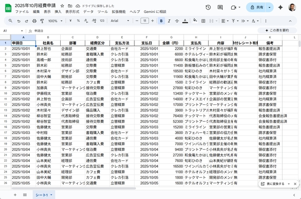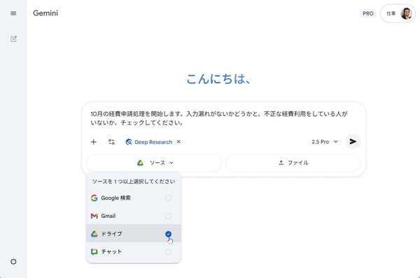 次は、社員からの経費申請のチェックをしてもらった。1ヵ月分の申請内容が記載されたGoogleスプレッドシートを用意し、入力漏れと不正申告を確認させてみる。「Deep Research」をオンにして「ソース」を開き、今度は「ドライブ」にチェックを入れる。プロンプトはシンプルにした。
