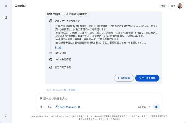 すると、Geminiはドライブの中を予備チェックし、「業務マニュアル」を発見。その中から、経費精算のルールを参照するというプランを出してきた。マニュアルを確認せよという指示は出していないのに、この対応はすごい。ただし、状況に応じては、余計なおせっかいとなることもあるだろう。「Deep Research」のプランニングはよくチェックする必要がありそうだ。