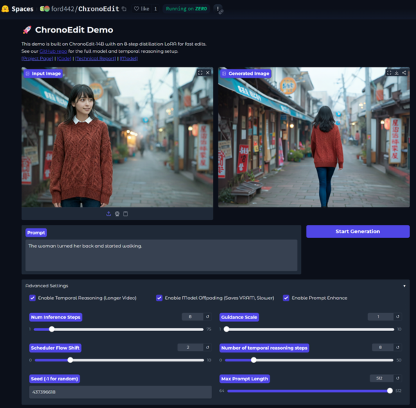 ところが、表示がほとんど変化しないこともあります。その場合、Advanced Settingsの「Enable Temporal Reasoning」と「Enable Prompt Enhance」をオンにしてください。生成時間は60秒から120秒ほどと大幅に長くなりますが、適切に出る確率が高まります。