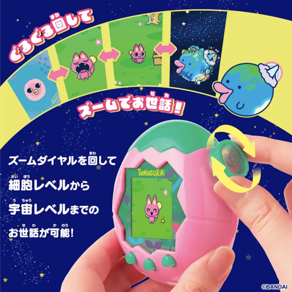 まずは物理的なインターフェース面の魅力に触れる。たまごっちパラダイスは、右上部に備えるダイヤルを回転させることで、ミクロとマクロの世界を自在に行き来できるUIを搭載している。