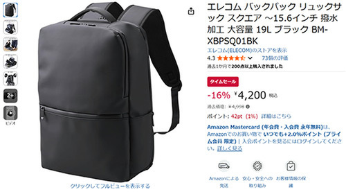 エレコム(ELECOM)のスクエアバックパック「BM-XBPSQ01BK」が、Amazonのタイムセールに登場しました。