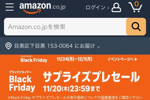 Amazon.co.jpで11月19日から、ブラックフライデーセール本番開始の11月24日を前にした「サプライズプレセール」がすでに始まっている。開催期間は11月20日23時59分まで。