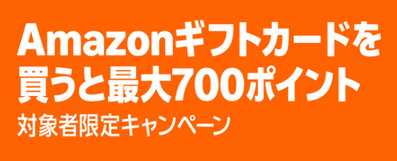まずは必ずチェックしてほしいのが、このキャンペーン。対象者限定ながら、Amazonギフトカードを5000円以上購入すると300ポイント、1万円~1万9999円で500ポイント、2万円以上で700ポイントもらえるというものです。