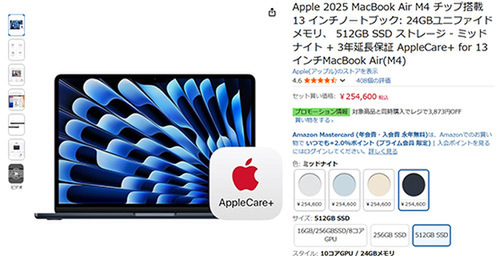 MacBook Air M4 、AppleCare+付きで12%オフ!軽量&高速の最強セット/Amazonブラックフライデー