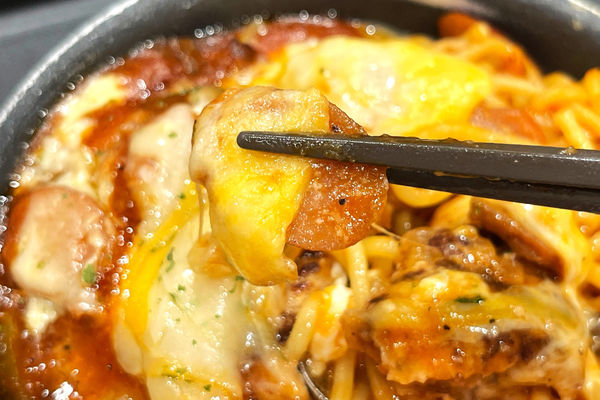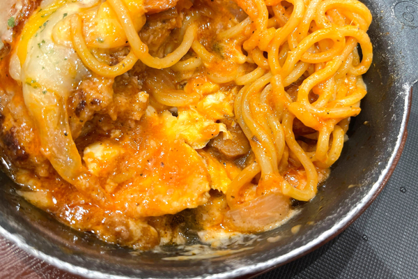 とろけたチーズとナポリタンソースが全体にかかっていて、見た目は洋食屋さんの豪快な日替わりランチ。輪切りソーセージが散らばっているのが、どこか懐かしくも愛らしいです。