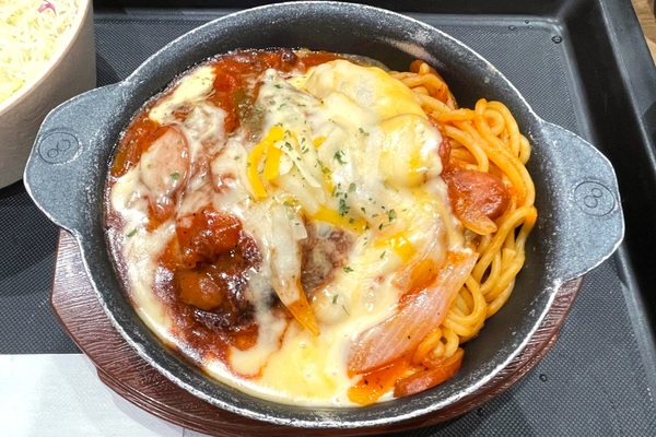 ハンバーグはいつもの松屋ハンバーグ。ふっくら厚みがあります。そこにナポリタンソースとチーズが混ざり合うと、もう完全に洋食店の皿。