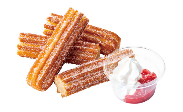 苺の果肉がごろっと入ったソースとホイップクリームに、サクッともちもち食感のチュロをディップして楽しむスイーツ。