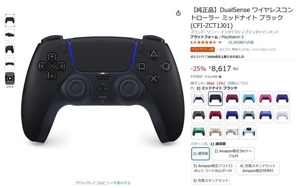 現在Amazonでは「DualSense ワイヤレスコントローラー」を最大25%オフで提供中。通常1万1480円する製品が8617円になるなど、お買い得感の強いセールとなっている。