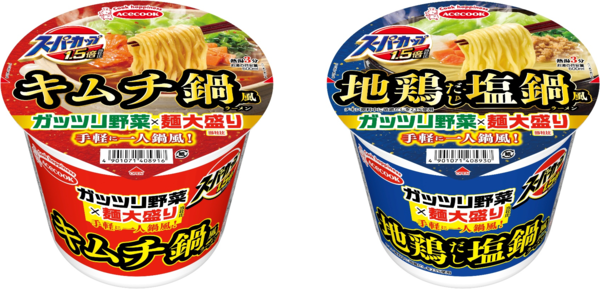 エースコックは12月15日より「スーパーカップ1.5倍 キムチ鍋風ラーメン/地鶏だし塩鍋風ラーメン」(各276円)を発売する。