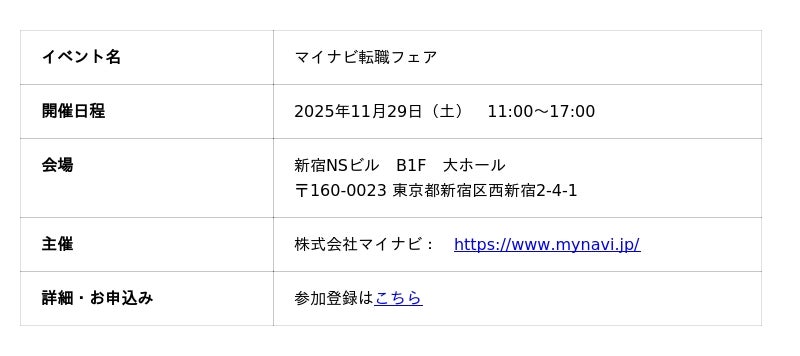 株式会社アイエスエフネット(本社:東京都港区/代表取締役:渡邉幸義、以下アイエスエフネット)は、2025年11月29日(土)に東京・新宿で開催される「マイナビ転職フェア」に参加いたします。
