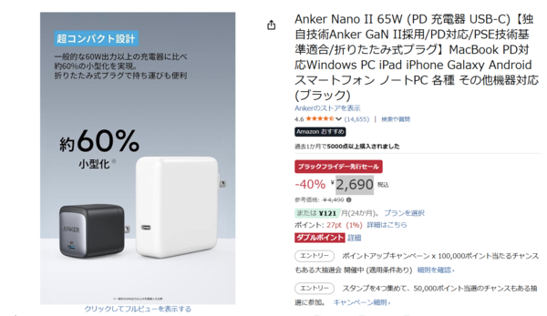 【2,690円】65WでiPhone 17もノートPCも充電! Anker Nano IIが40%オフ/ブラックフライデー先行セール