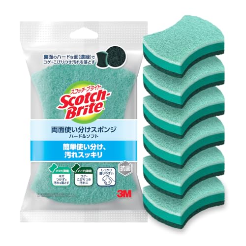 汚れたままで使いたくないから余剰を常備しておきたいキッチン用のスポンジ。こちらの3Mの製品、表と裏でハード&ソフトが使い分けられます。6個セットで823円。