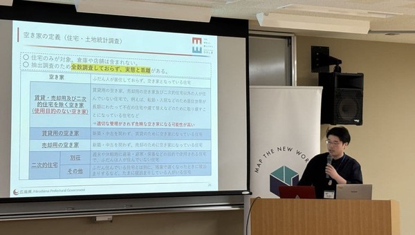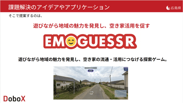 チーム「エモゲッサー」は、空き家問題をテーマにしたアイデア「EMOGUESSR(エモゲッサー)」を発表した。身近な事例として、メンバーの実家が空き家になっていることをきっかけに具体策を検討した。広島県には使用目的のない空き家が11万4700戸あるが、空き家バンクに登録されているのは約800戸にとどまっており、市場に流通していないことが課題となっているという。