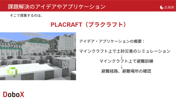 チーム「やんぐぴーぽー」は、防災・減災をテーマとした作品「PLACRAFT(プラクラフト)」を発表。現状の避難訓練は「作業としてこなすだけで意識に残らない」という問題意識から、マインクラフトの遊びやゲーム要素を取り入れて、子どもが主体的に学び、家庭にも災害に対する意識を波及させる仕組みを目指した。